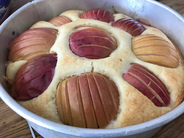 Coffee Cake for a Birthday Cake? Why Not? This is a cake I have wanted to try as the placement of apples on the cake top is decorative. Another recipe I saw, used whole apples that were pushed into the batter, but this looked great. I use to make a coffee cake in our previous home as we had an apple tree in our backyard that filled our crisper with tons of fruit. Bavarian Apple Cake and a coffee cake filled with chopped apples and a Streusel topping were my favourite to make.