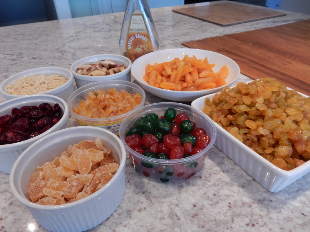 A total of 7 cups of dried fruit was prepared and marinated in 1/3 cup of rum for a couple of days.